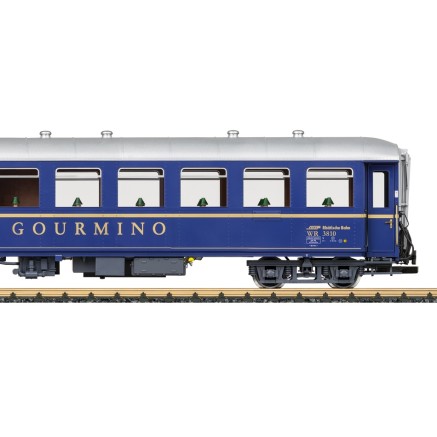 Der Speisewagen "Gourmino" erscheint mit neuer Betriebsnummer (WR 3810) und passt perfekt in den Alpine-Classic Zug.