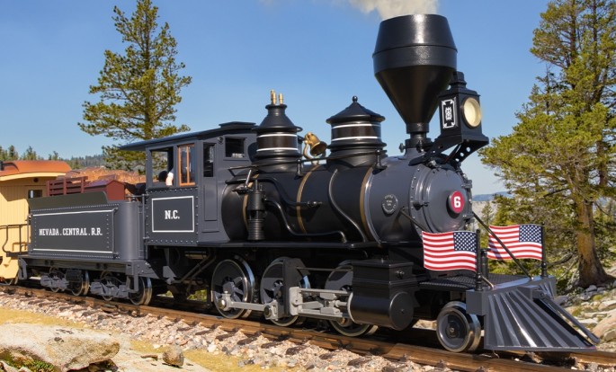 ... war eine kleine Bahngesellschaft mitten in Nevada, deren Fahrzeuge teilweise noch heute bestaunt werden können. Obwohl die rund 90 km lange Strecke bereits 1938 stillgelegt und zügig abgebaut wurde, sind auffällig viele Fahrzeuge bis heute erhalten geblieben. Die berühmteste Lokomotive dieser kleinen "3-Foot" -Bahn ist wohl die frühere #2. Diese Lok wurde vom bekannten Disney-Zeichner und Eisenbahn-Enthusiast Ward Kimbell Ende der 1930er Jahre erworben und liebevoll restauriert. Sie fuhr bei der "Grizzly Flats Railroad" in seinem Garten und ist heute museal erhalten. Zwei weitere Lokomotiven findet man Eisenbahnmuseum in Sacramento/ Kalifornien. Auch die Vorbilder der beiden Personenwagen aus diesem LGB-Programm sind dort zuhause. Ihre besondere Farbgebung hat LGB motiviert sie letztlich ins Modell umzusetzen.