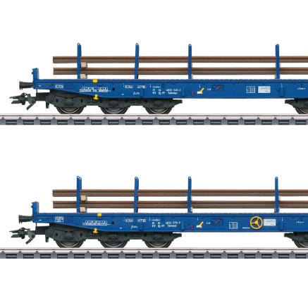 Auch die niederländische NS besaß 6-achsige Schwerlastwagen ähnlich den DB Bauarten Samms 709/710 nach Auflösung der Güterverkehrssparte der NS und teilweisen Übernahme durch die DB AG wurden diese Wagen auch an private EVU verkauft. Das Set beinhaltet zwei solche Wagen die zuerst von Railpro und heute bei der Voest Alpine Track Solutions NL eingestellt sind.