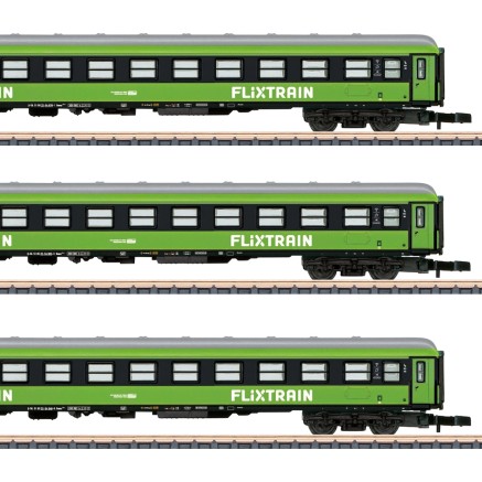 Set aus drei FLIXTRAIN Reisezugwagen der Typen Bmmz 264.4F und 264.4. Die Vorbilder gehören der Firma Trainpool und sind an FLIXTRAIN vermietet. Die Wagen besitzen eine werkseitig eingebaute Innenbeleuchtung.