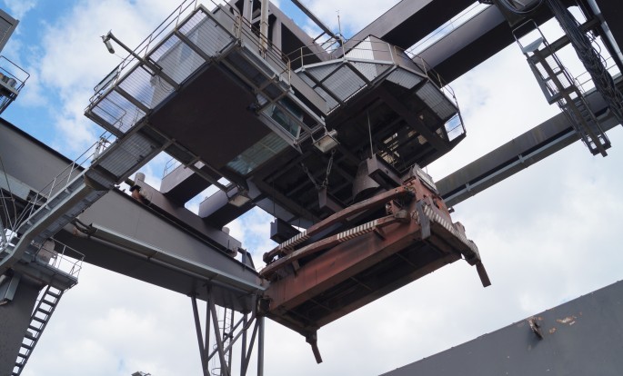 Im Bild, ein Greifrahmen eines modernen Containerterminals für die Aufnahme von Containern oder LKW-Aufliegern. Copyright: J.Franke